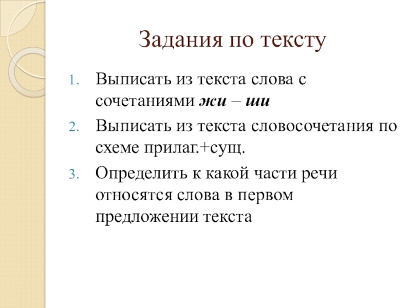 Задания по тексту Выписать из текста слова с сочетаниями жи – шиВыписать из текста словосочетания по схеме