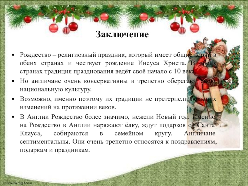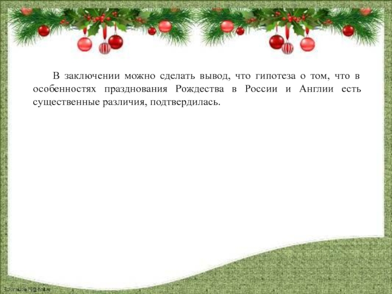 Цель работы: проанализировать особенности празднования Рождества в России и Англии, сделать вывод о сходствах и различиях в традициях двух стран.
