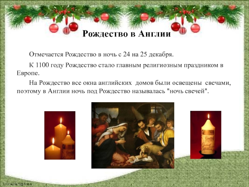 На Рождество все окна английских домов были освещены свечами, поэтому в Англии ночь под Рождество называлась "ночь свечей".