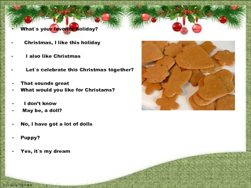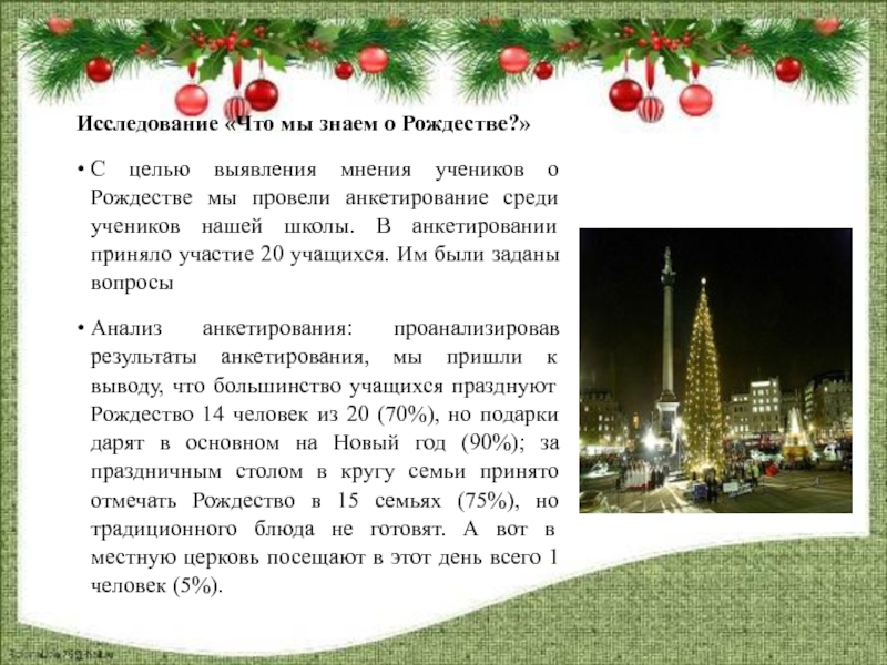 Анализ анкетирования: проанализировав результаты анкетирования, мы пришли к выводу, что большинство учащихся празднуют Рождество 14 человек из 20 (70%), но подарки дарят в основном на Новый год (90%); за праздничным столом в кругу семьи принято отмечать Рождество в 15 семьях (75%), но традиционного блюда не готовят. А вот в местную церковь посещают в этот день всего 1 человек (5%).