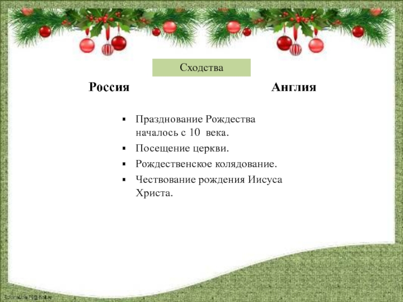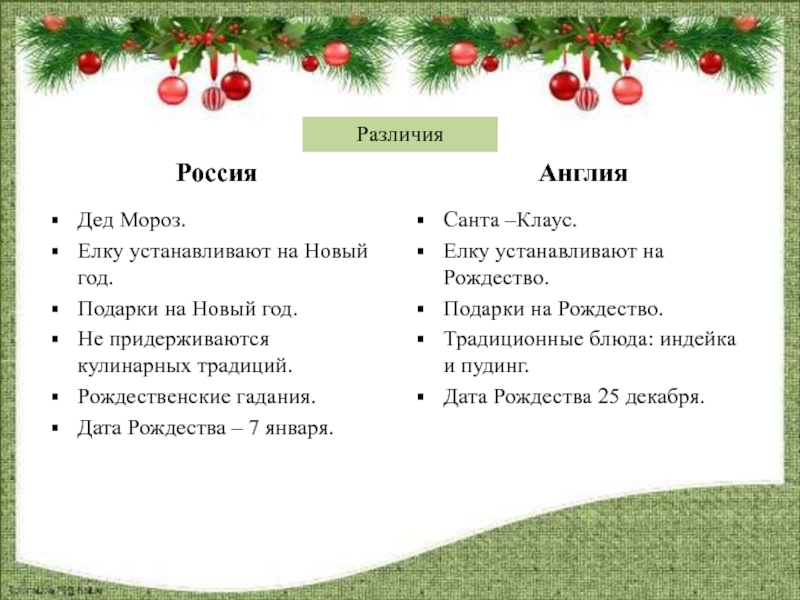 Рождества в культурах России и Англии, выделить сходства и различия.