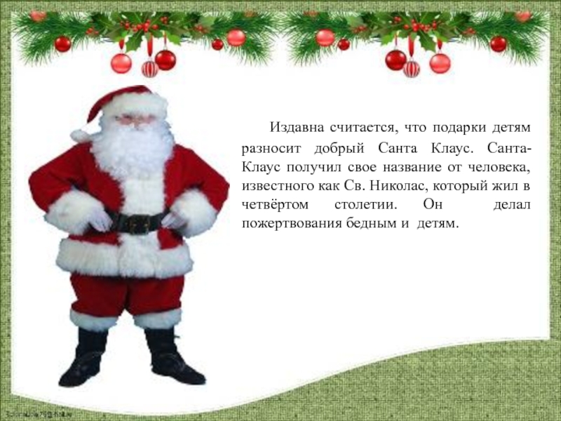 Слайд 7 Издавна считается, что подарки детям разносит добрый Санта Клаус. Санта-Клаус получил
