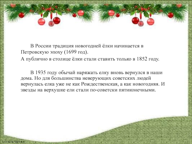 Слайд 5 В России традиция новогодней ёлки начинается в Петровскую эпоху (1699 год).