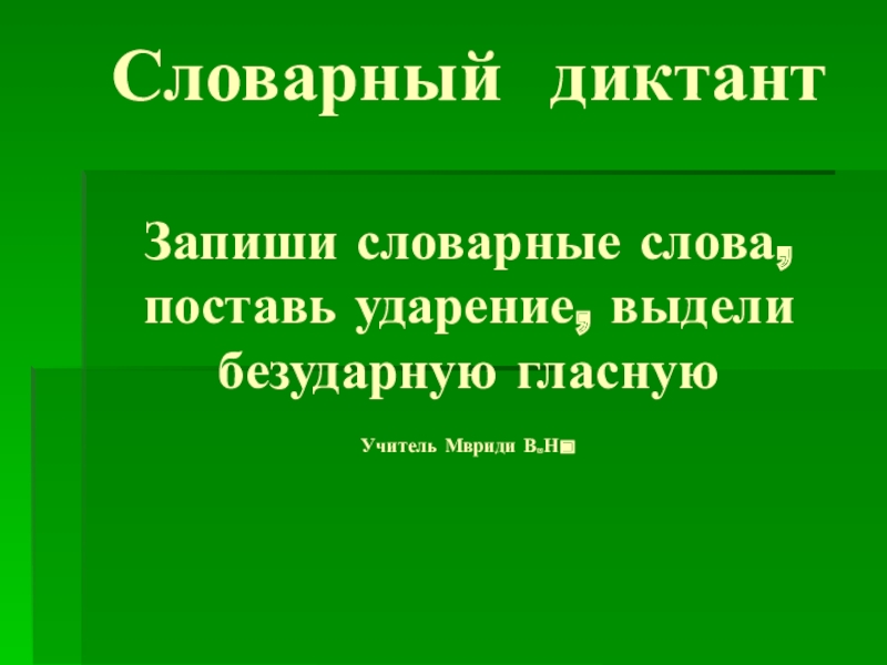 Слайд 1Словарный диктант Запиши словарные слова, поставь ударение, выдели безударную гласную Учитель Мвриди В.Н.
