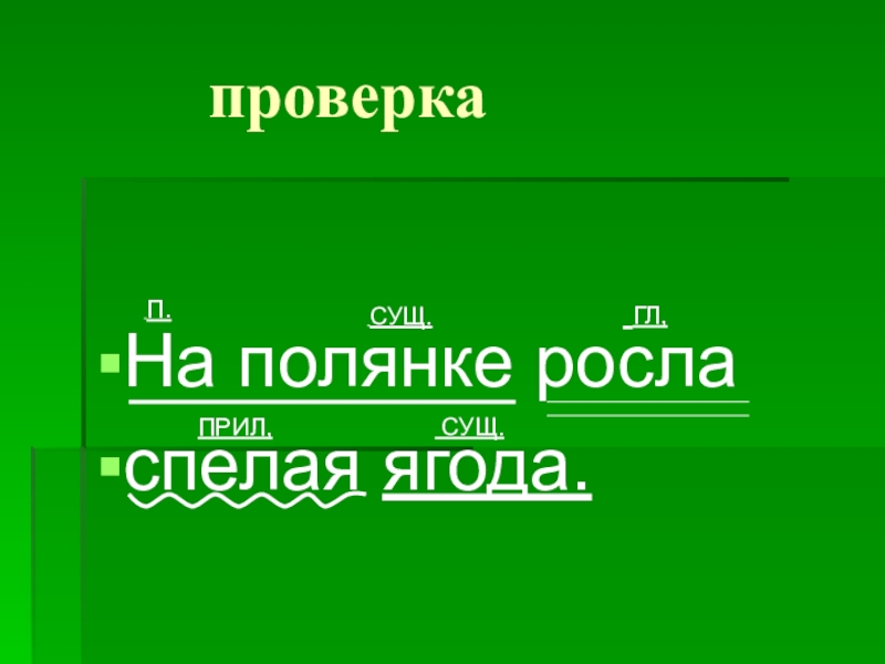 проверкаНа полянке росла спелая ягода. П. СУЩ. ГЛ,ПРИЛ, СУЩ.