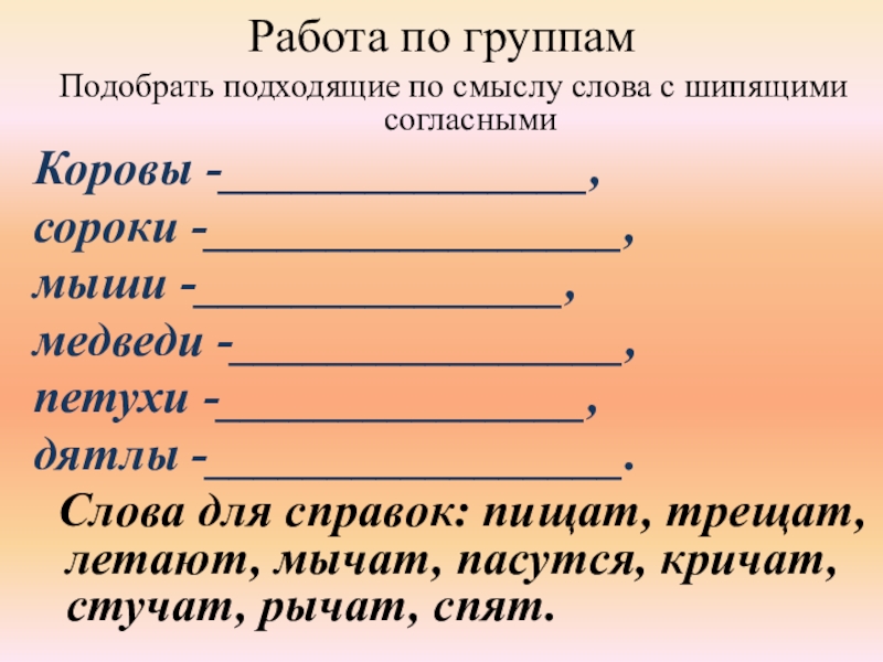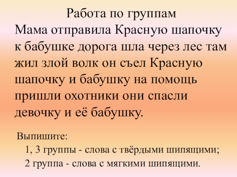 1, 3 группы - слова с твёрдыми шипящими;