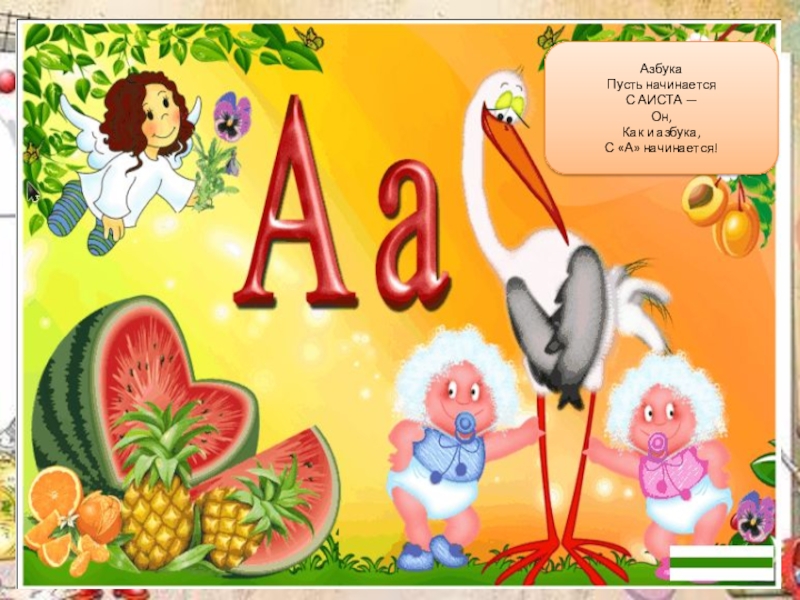 Слайд 3Азбука Пусть начинается С АИСТА — Он, Как и азбука, С «А» начинается!