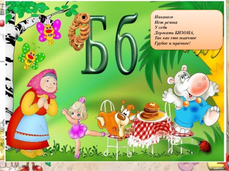 Слайд 4Никакого Нет резона У себя Держать БИЗОНА, Так как это жвачное Грубое и мрачное!