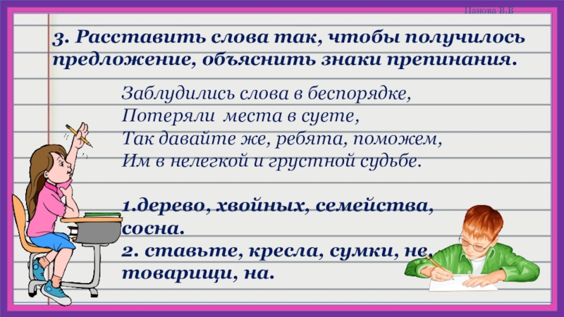 3. Расставить слова так, чтобы получилось предложение, объяснить знаки препинания.