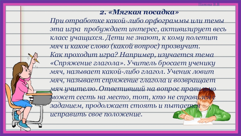Как проходит игра? Например, изучается тема «Спряжение глагола». Учитель бросает ученику мяч, называет какой-либо глагол. Ученик ловит мяч, называет спряжение глагола и возвращает мяч учителю. Ответивший на вопрос правильно может сесть на место, тот, кто не справился с заданием, продолжает стоять и пытается исправить свое положение.