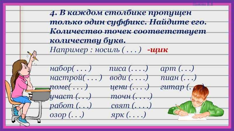 Слайд 324. В каждом столбике пропущен только один суффикс. Найдите его. Количество