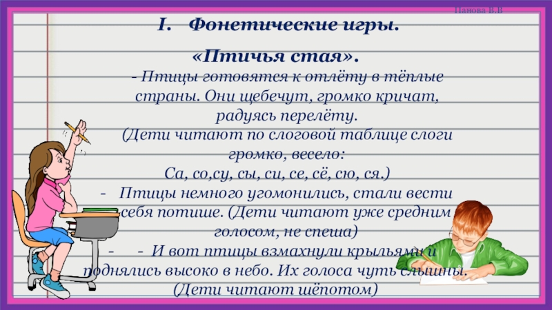 - И вот птицы взмахнули крыльями и поднялись высоко в небо. Их голоса чуть слышны. (Дети читают шёпотом)