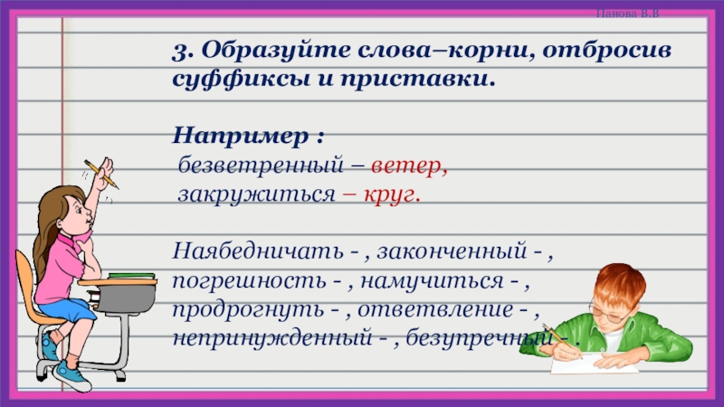 Слайд 313. Образуйте слова–корни, отбросив суффиксы и приставки.