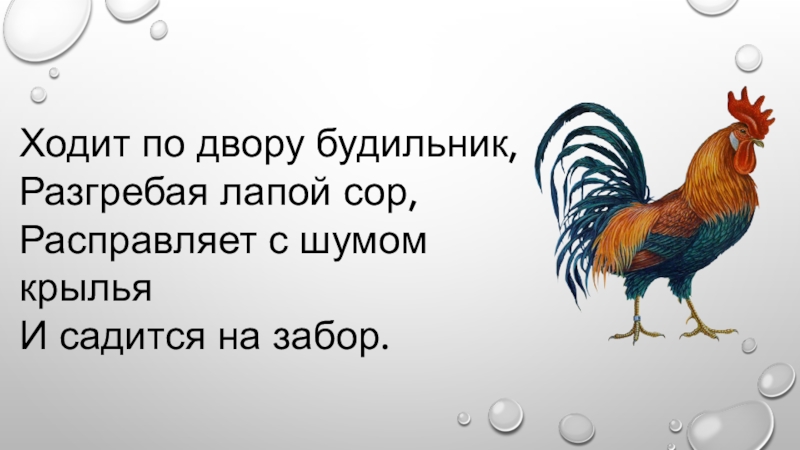 Ходит по двору будильник, Разгребая лапой сор,Расправляет с шумом крыльяИ садится на забор.