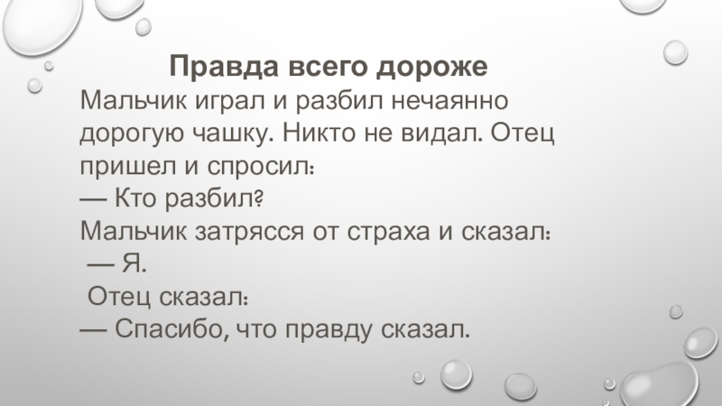 Правда всего дорожеМальчик играл и разбил нечаянно дорогую чашку. Никто не видал. Отец пришел и спросил: —