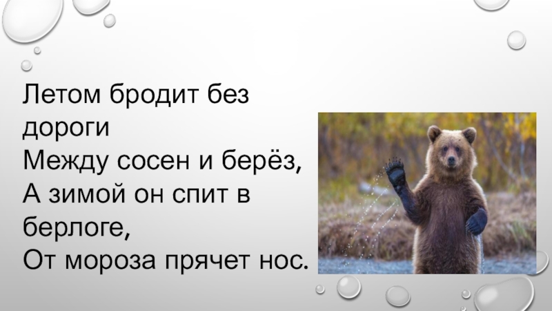 Летом бродит без дорогиМежду сосен и берёз,А зимой он спит в берлоге,От мороза прячет нос.