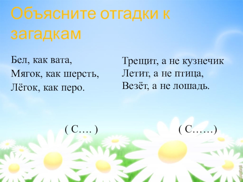 Объясните отгадки к загадкамБел, как вата,Мягок, как шерсть,Лёгок, как перо.