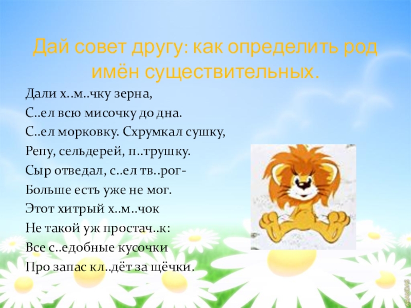 Дай совет другу: как определить род имён существительных.Дали х..м..чку зерна,С..ел всю мисочку до дна.С..ел морковку. Схрумкал сушку,Репу,