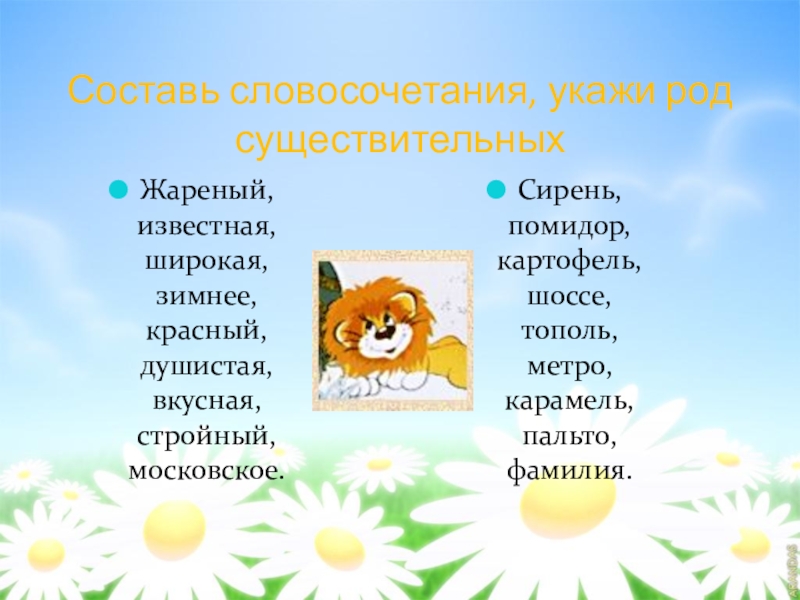 Составь словосочетания, укажи род существительныхЖареный, известная,  широкая,    зимнее,    красный,