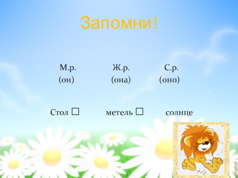 Проверь себя!М.р. (он)	Дядя, заяц, день, стол.Ж.р. (она)	Волна, тётя, земля, бабушка, зайчиха, девочка.С.р.	Гнездо, море, кольцо, письмо.