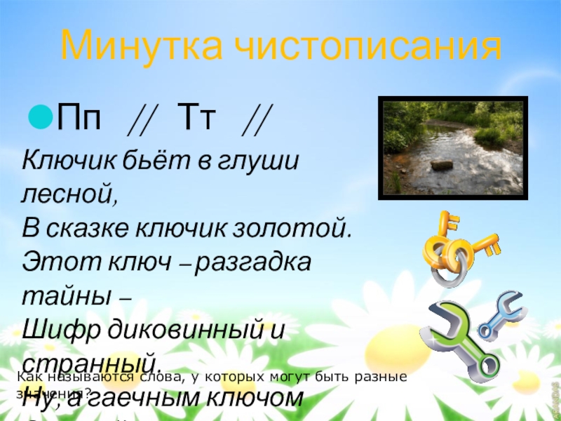 Пп // Тт // Ключик бьёт в глуши лесной,В сказке ключик золотой.Этот ключ – разгадка тайны –Шифр диковинный и странный.Ну, а гаечным ключомЭту гайку завернём.Как называются слова, у которых могут быть разные