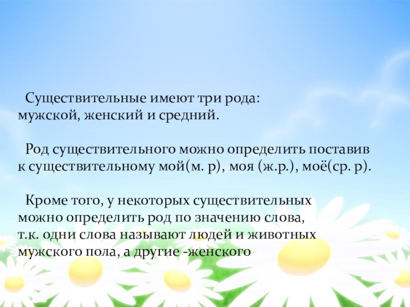 Род имени существительного. Существительные имеют три рода:мужской, женский и средний.  Род существительного можно определить поставив к