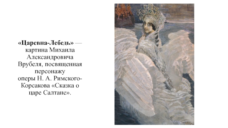 Слайд 10«Царевна-Лебедь» — картина Михаила Александровича Врубеля, посвященная персонажу оперы Н. А. Римского-Корсакова «Сказка о царе Салтане».
