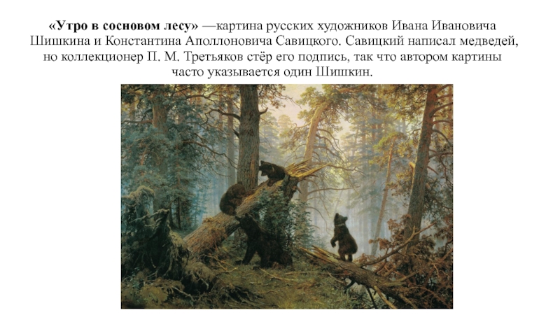 Слайд 8«Утро в сосновом лесу» —картина русских художников Ивана Ивановича Шишкина и Константина Аполлоновича Савицкого.