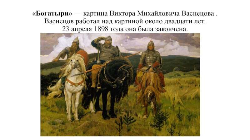Слайд 2«Богатыри» — картина Виктора Михайловича Васнецова . Васнецов работал над картиной около двадцати