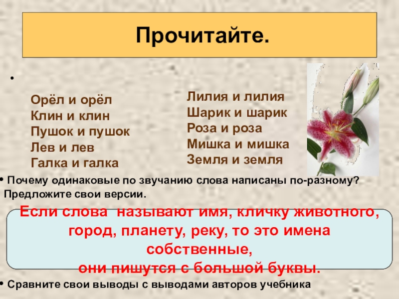 Почему одинаковые по звучанию слова написаны по-разному? Предложите свои версии.