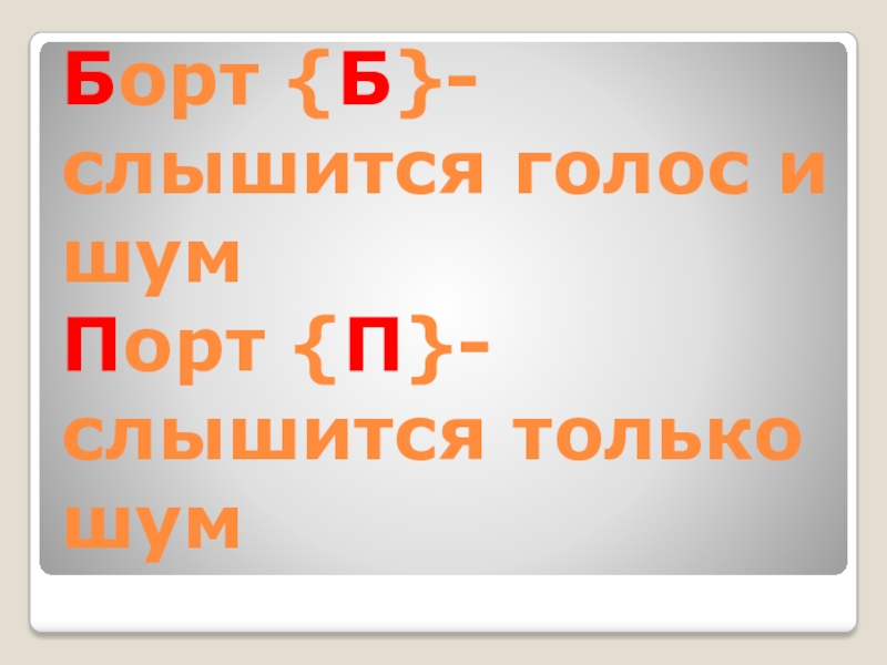 Слайд 6Борт {Б}-слышится голос и шум Порт {П}- слышится только шум