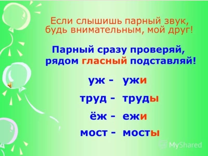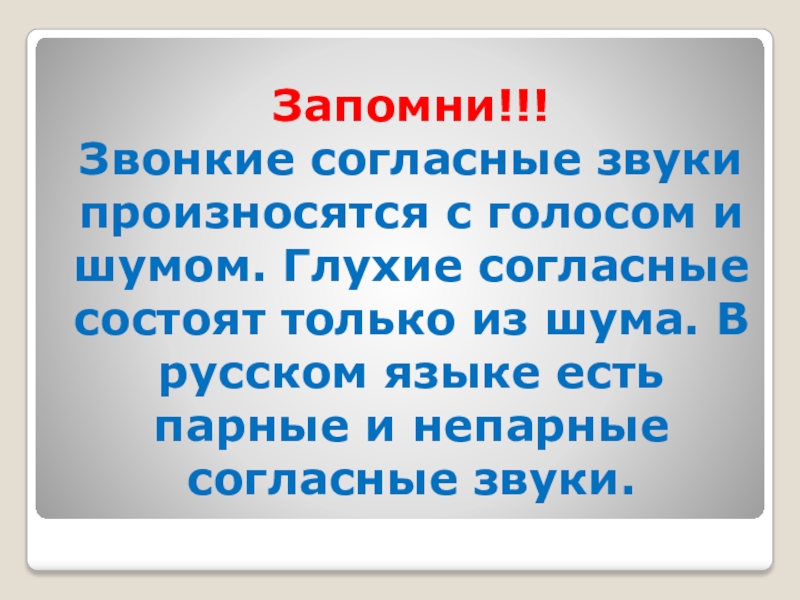 Слайд 7Запомни!!! Звонкие согласные звуки произносятся с голосом и шумом. Глухие согласные состоят