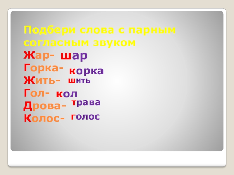 Слайд 10Подбери слова с парным согласным звуком Жар- Горка- Жить- Гол- Дрова- Колос-