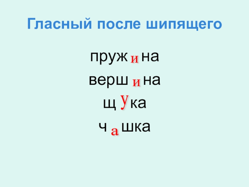 Гласный после шипящегопруж  наверш  нащ  кач  шкаи и у а