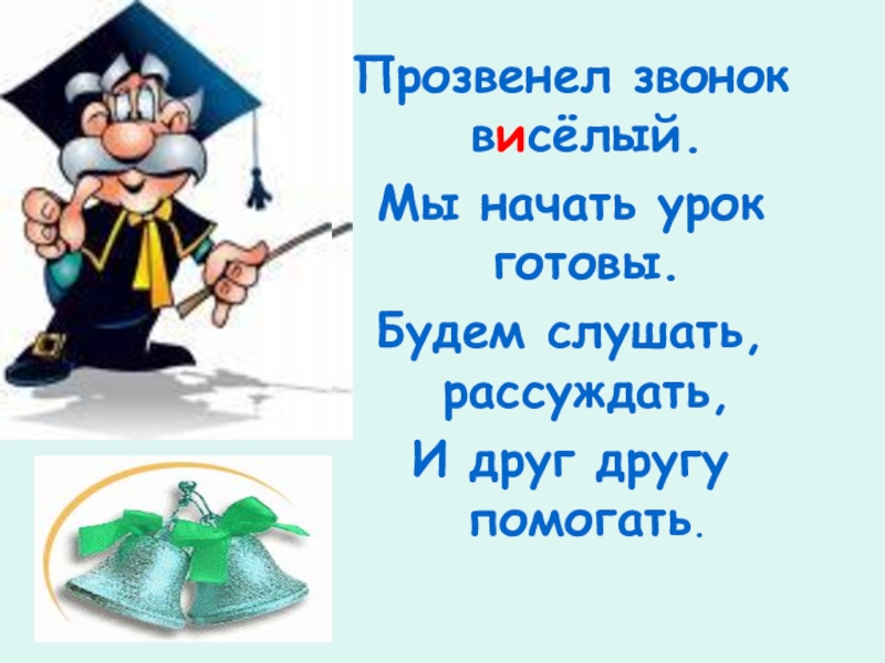 Прозвенел звонок висёлый.Мы начать урок готовы.Будем слушать, рассуждать,И друг другу помогать.
