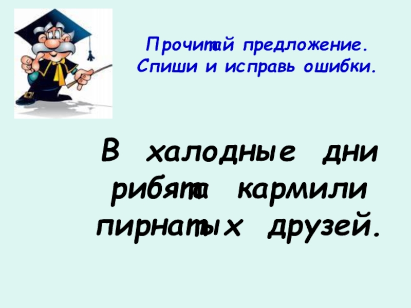 Прочитай предложение. Спиши и исправь ошибки.В халодные дни рибята кармили пирнатых друзей.
