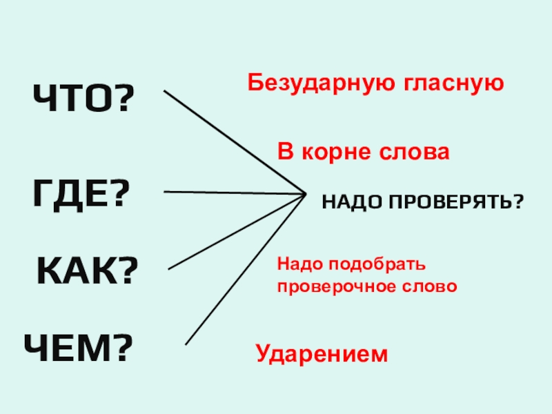 ЧТО?ГДЕ?КАК?ЧЕМ?НАДО ПРОВЕРЯТЬ?Безударную гласнуюВ корне словаНадо подобрать проверочное словоУдарением