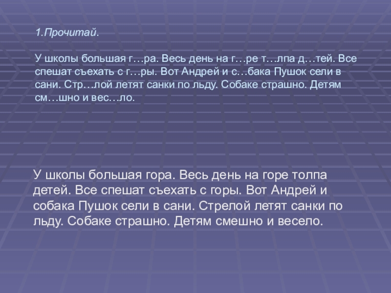 У школы большая гора. Весь день на горе толпа детей. Все спешат съехать с горы. Вот Андрей и собака Пушок сели в сани. Стрелой летят санки по льду. Собаке страшно. Детям смешно и весело.