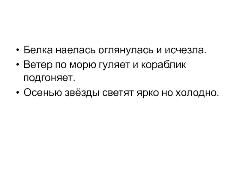 Белка наелась оглянулась и исчезла.Ветер по морю гуляет и кораблик подгоняет.Осенью звёзды светят ярко но холодно.