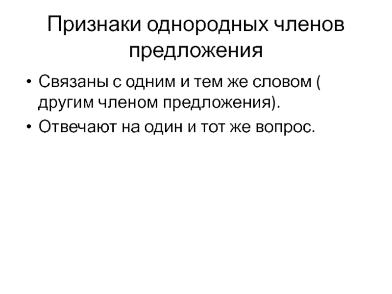 Признаки однородных членов предложенияСвязаны с одним и тем же словом ( другим членом предложения).Отвечают на один и тот же вопрос.