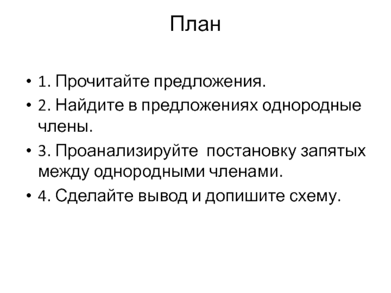 План 1. Прочитайте предложения.2. Найдите в предложениях однородные члены.3. Проанализируйте постановку запятых между однородными членами.4. Сделайте вывод