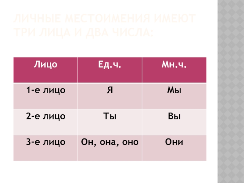 Слайд 4Личные местоимения имеют три лица и два числа: