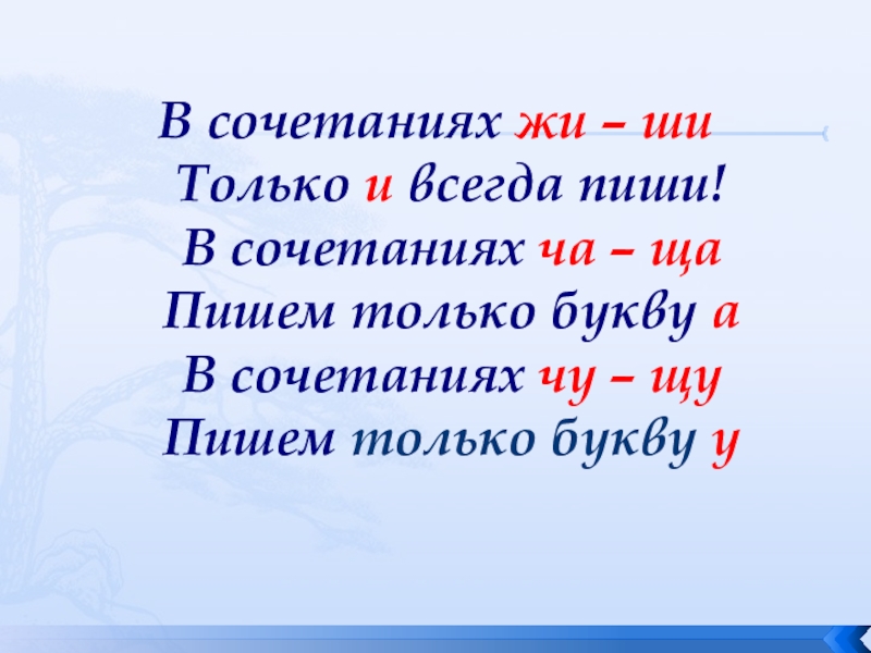 В сочетаниях жи – ши Только и всегда пиши! В сочетаниях ча – ща Пишем только букву