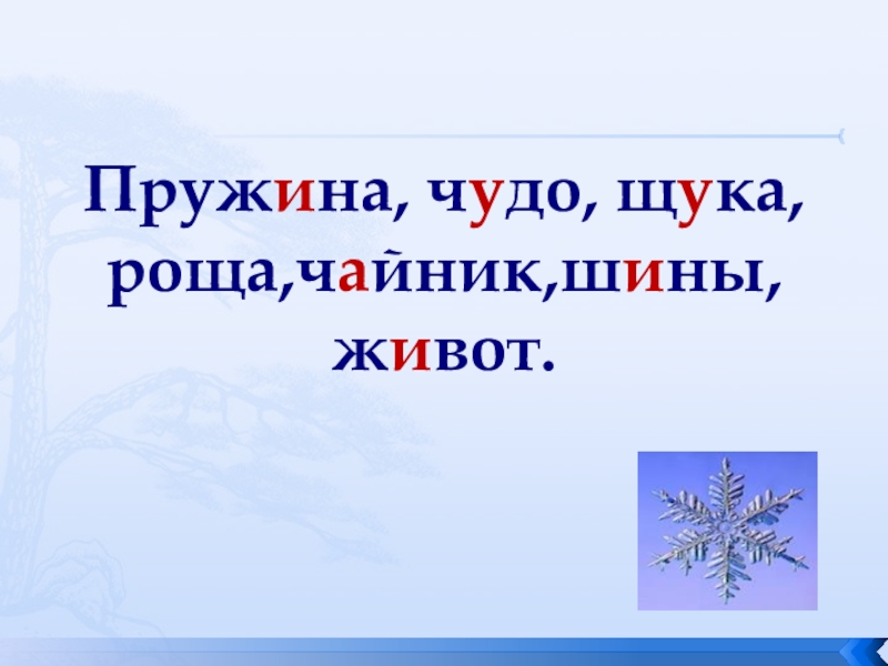 Слайд 17Пружина, чудо, щука, роща,чайник,шины, живот.