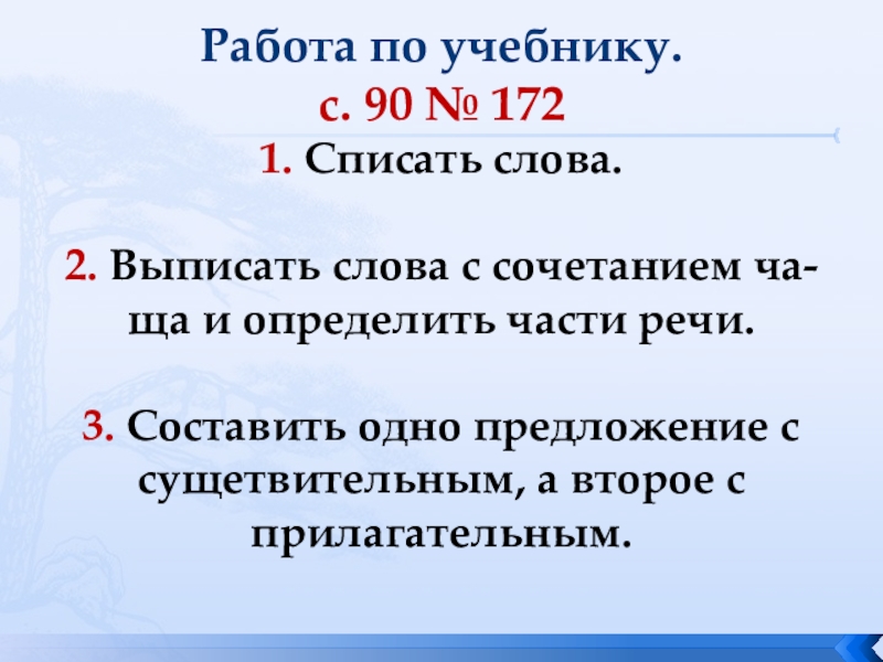 Работа по учебнику. с. 90 № 172 1. Списать слова.  2. Выписать слова с сочетанием ча-ща