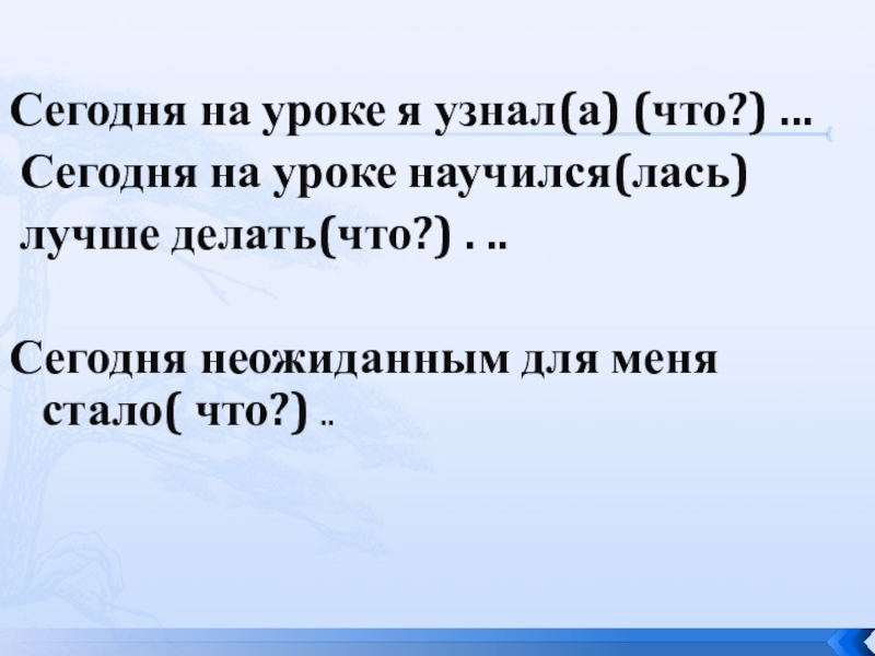 Сегодня на уроке я узнал(а) (что?) ... Сегодня на уроке научился(лась) лучше делать(что?) . .. Сегодня неожиданным