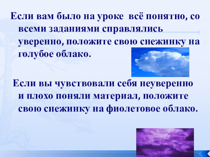 Если вы чувствовали себя неуверенно и плохо поняли материал, положите свою снежинку на фиолетовое облако.
