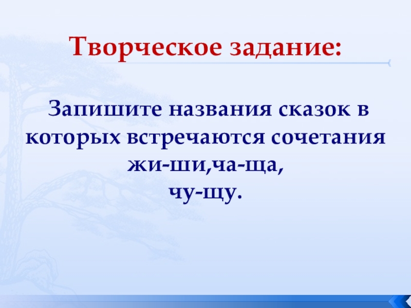 Слайд 22Творческое задание: Запишите названия сказок в которых встречаются сочетания жи-ши,ча-ща, чу-щу.
