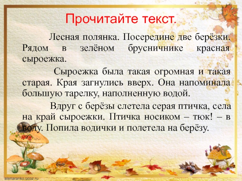 Прочитайте текст.    Лесная полянка. Посередине две берёзки. Рядом в зелёном брусничнике красная сыроежка.