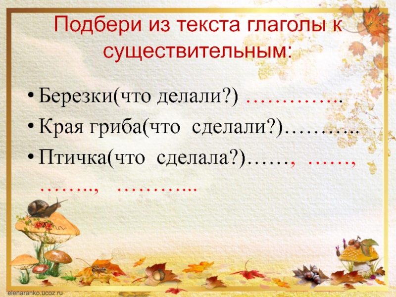 Подбери из текста глаголы к существительным:Березки(что делали?) …………..Края гриба(что сделали?)………..Птичка(что сделала?)……, ……, ……..,  ………...